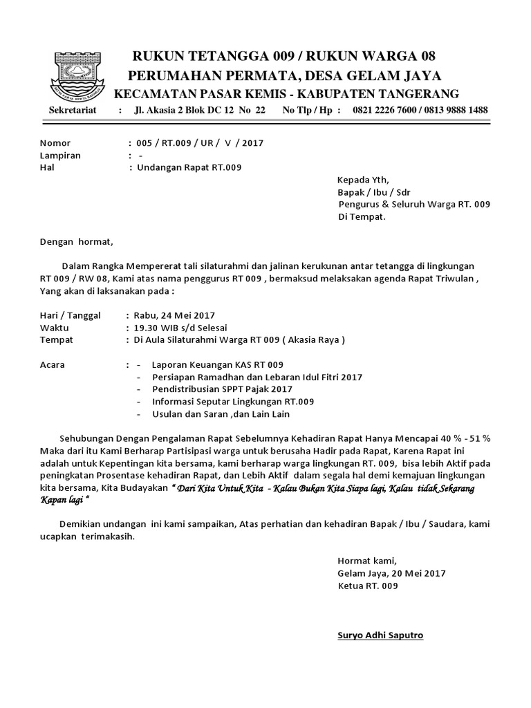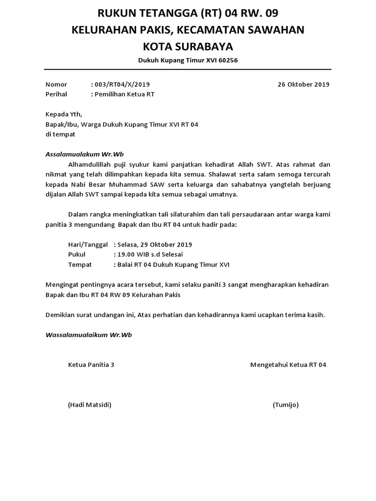 Bekasi, minggu 02 februari 2020. Di jakarta sehubungan dengan tahapan kegiatan pemilihan ketua rt kami memberitah. Contoh kop surat koperasi serba usaha. Terima kasih telah berkunjung ke blog kumpulan contoh surat 2020. Doc panitia pemilihan ketua rukun tetangga dimas satriyo. Tepatnya nanti pada tanggal 5 september 2013 acara akan dilaksanakan. Contoh surat edaran pemilihan rt. Contoh surat undangan rapat rt dan rw terbaru download contoh surat undangan rapat rt dan rw terbaru download format surat lain: 5 contoh surat pemberitahuan kegiatan berbagai acara. Contoh surat keputusan hasil perhitungan suara pemilihan ketua rt dan rw. The collection that consisting of chosen picture and the best amongst others. Surat undangan resmi seringkali dipakai untuk keperluan organisasi, instansi, keperluan dinas, perusahaan dan lain sebagainya. 15 contoh surat undangan resmi tidak resmi rapat.