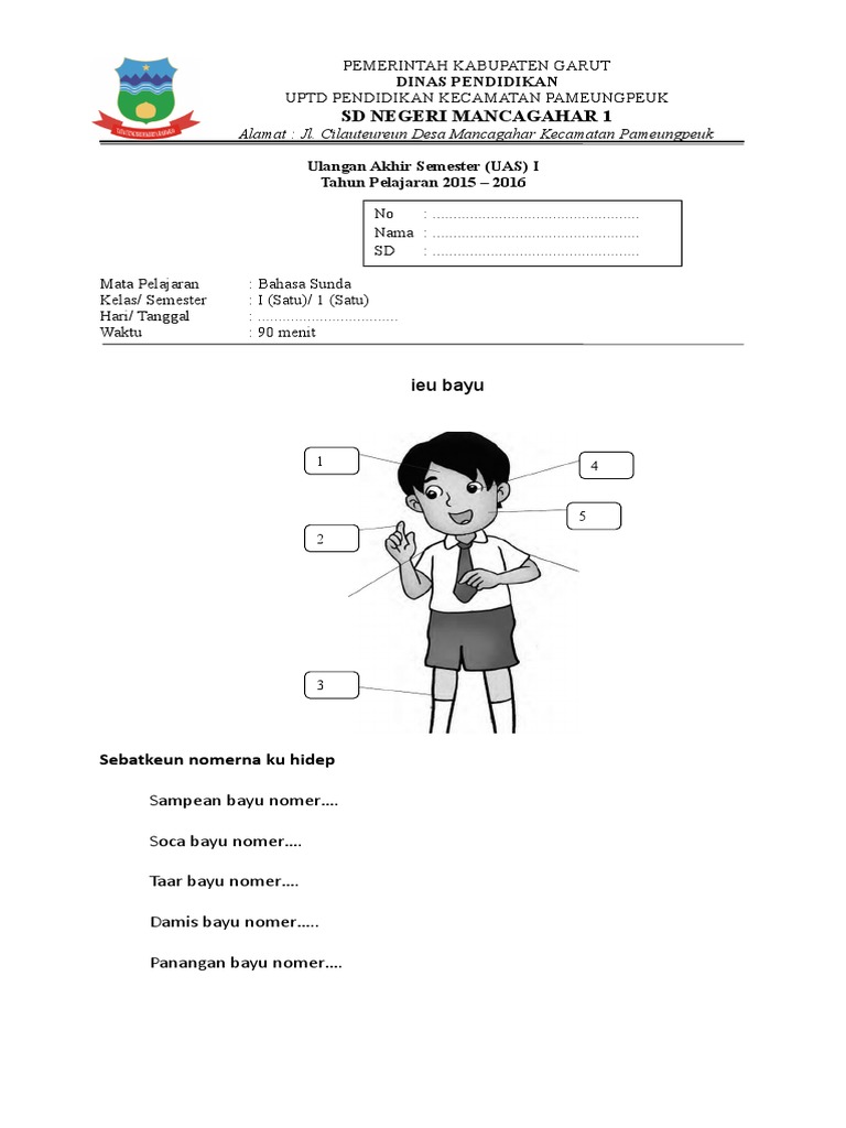 Soal uas ukk bahasa sunda kelas 4 sd semester 2. Pemerintah kabupaten garut dinas pendidikan uptd pendidikan kecamatan pameungpeuk sd negeri mancagahar 1 Cilauteureun desa mancagahar kecamatan pameungpeuk. Contoh soal uts bahasa sunda kelas 1 semester 2 kurikulum 2013 revisi 2022 2021. Sunda kelas iv ini terdiri dari 40 butir soal 25 pg 10 isian singkat dan 5 essay.