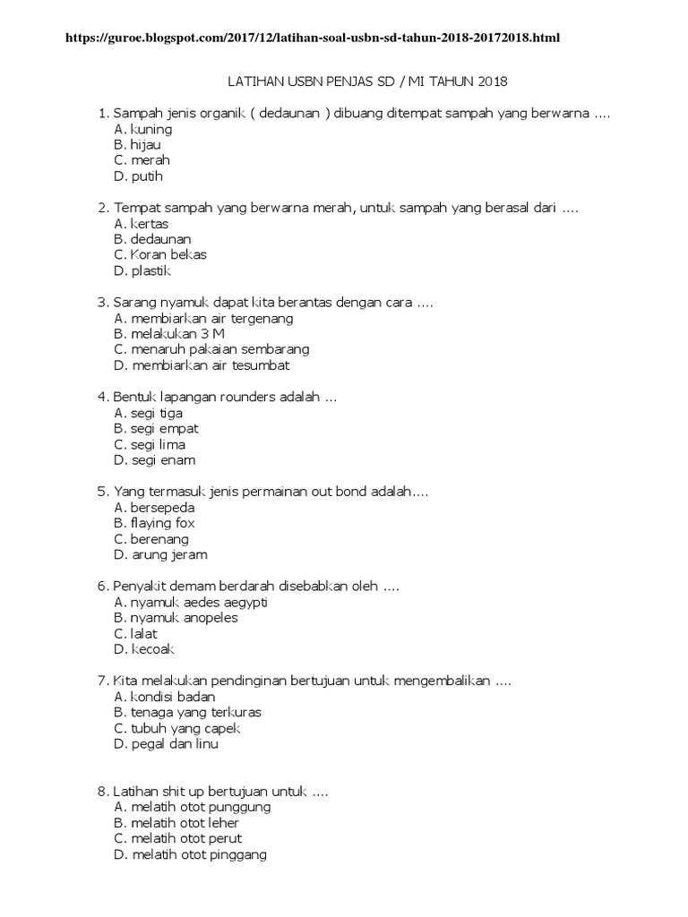 Rencana soal usbn sd tahun 2018 meliputi bahasa indonesia, matematika, ipa, ips, ppkn menurut pos un 2018 di bagian ketentuan umumnya disebutkan bahwa usbn adalah kegiatan. Soal usbn penjas kelas xii dan kunci jawaban. Soal usbn penjas dan uas smk 2018 k13. Sepertinya latihan soal usbn penjaskes (penjas) smp tahun 2018 disusun mengacu pada materi pelajaran penjasorkes (penjas) smp / mts. Latihan usbn penjas sd / mi tahun 20181. Soal essay penjaskes kelas xii dan jawabannya. Soal usbn penjas sma 2018 dan kunci jawaban. Latihan usbn penjas sd / mi tahun 2018. Sampah jenis organik ( dedaunan ) dibuang ditempat sampah yang berwarna.a. 20201114 soal usbn penjas sma dan kunci jawaban. Belum ada kejelasan terkait pelaksanaan ujian sekolah berstandar nasional (usbn) untuk delapan mata pelajaran (mapel) di jenjang sd. Contoh soal uts penjas kelas xii semester 1 beserta jawabannya (pg dan essay). Contoh soal dan jawaban usbn penjaskes kelas 12.
